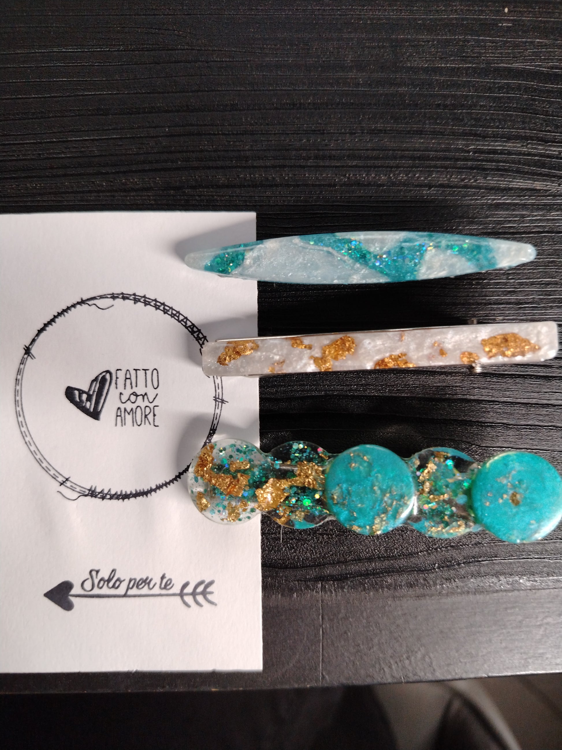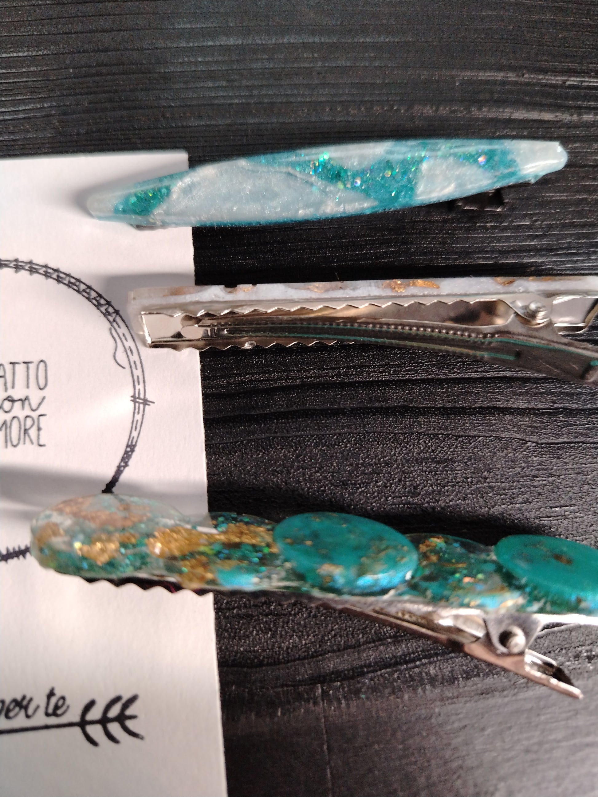 Set tre mollette con forcina coccodrillo in acciaio decorate con resina e pigmenti perlescenti e foglia oro