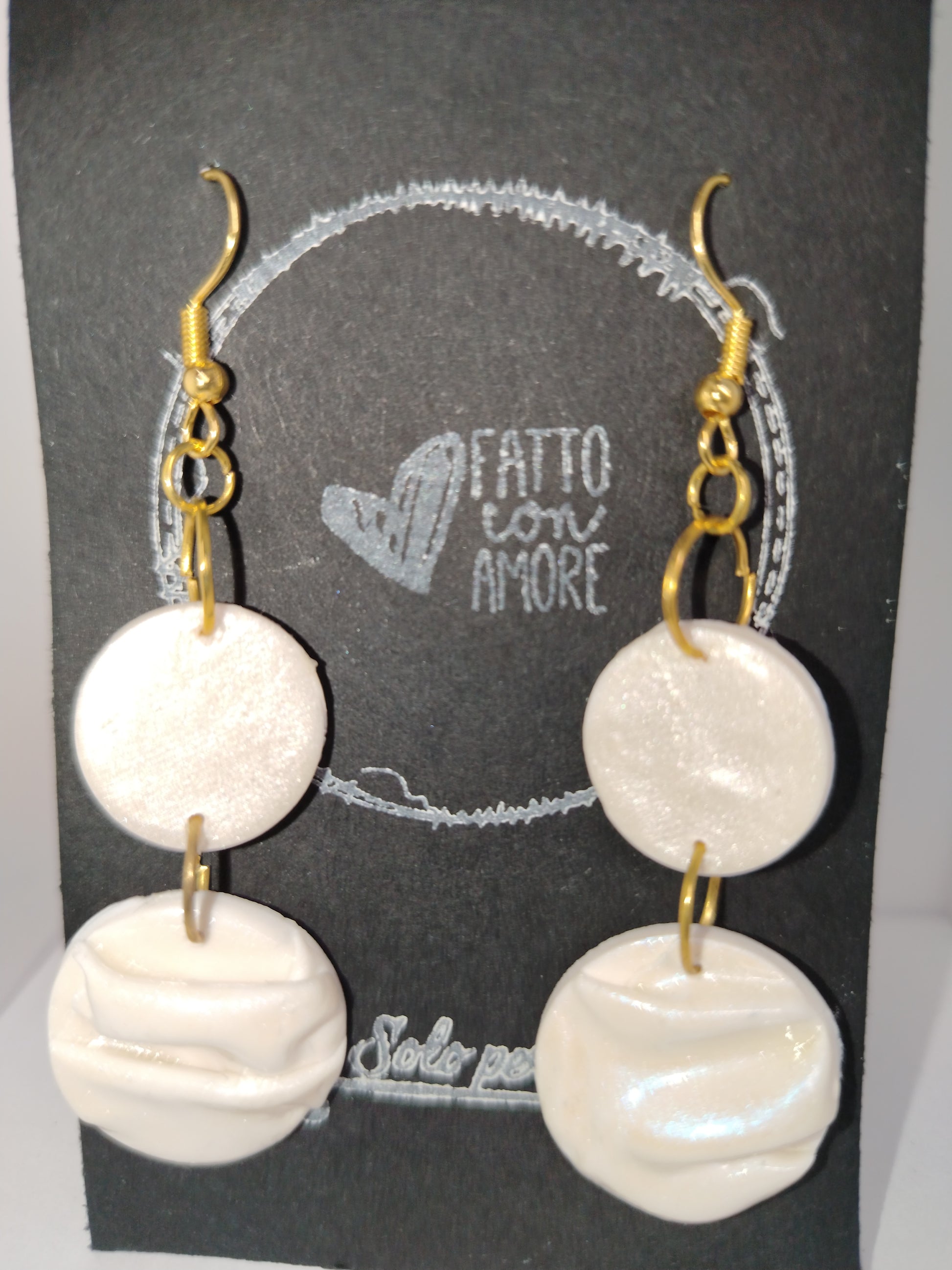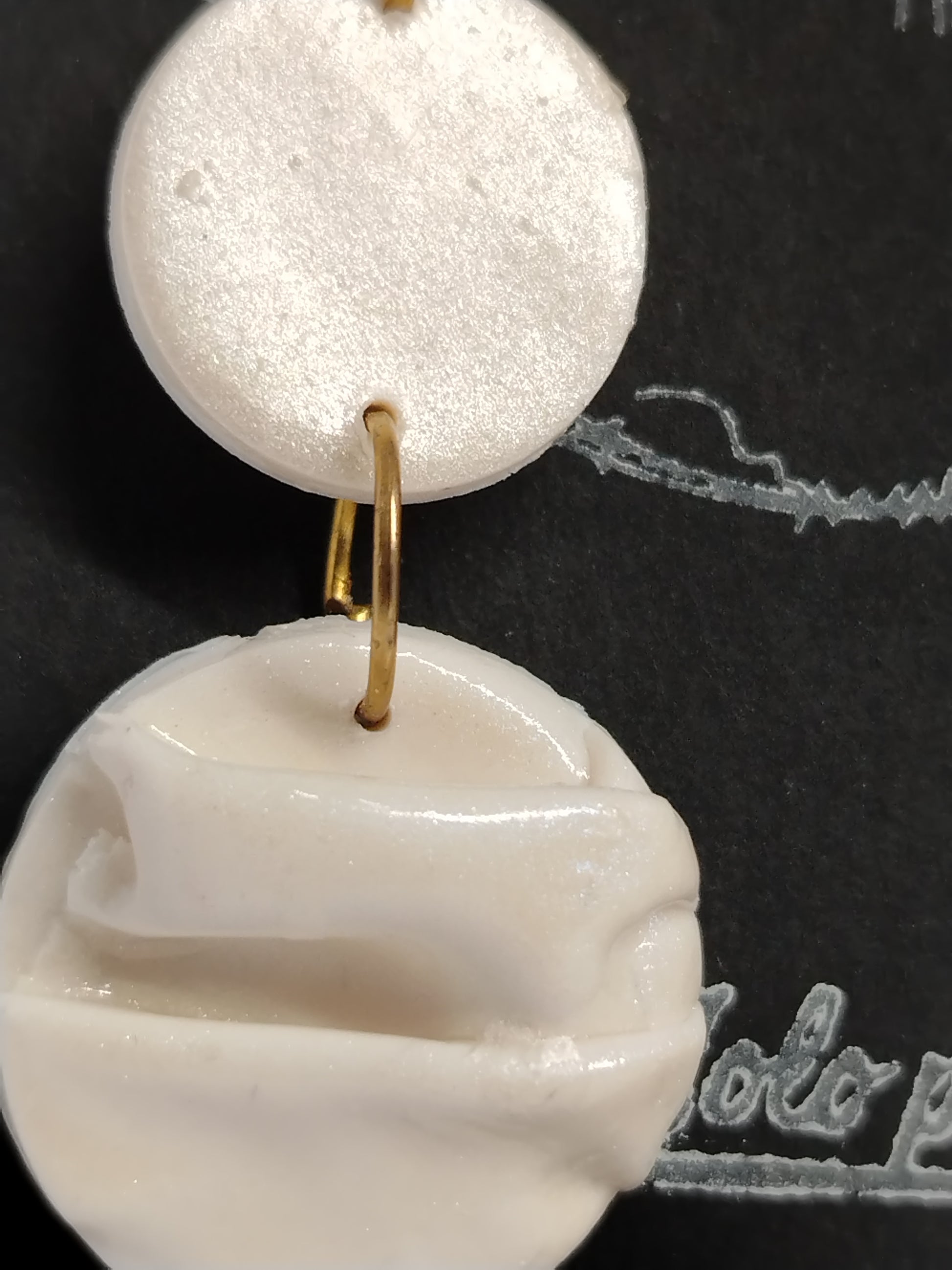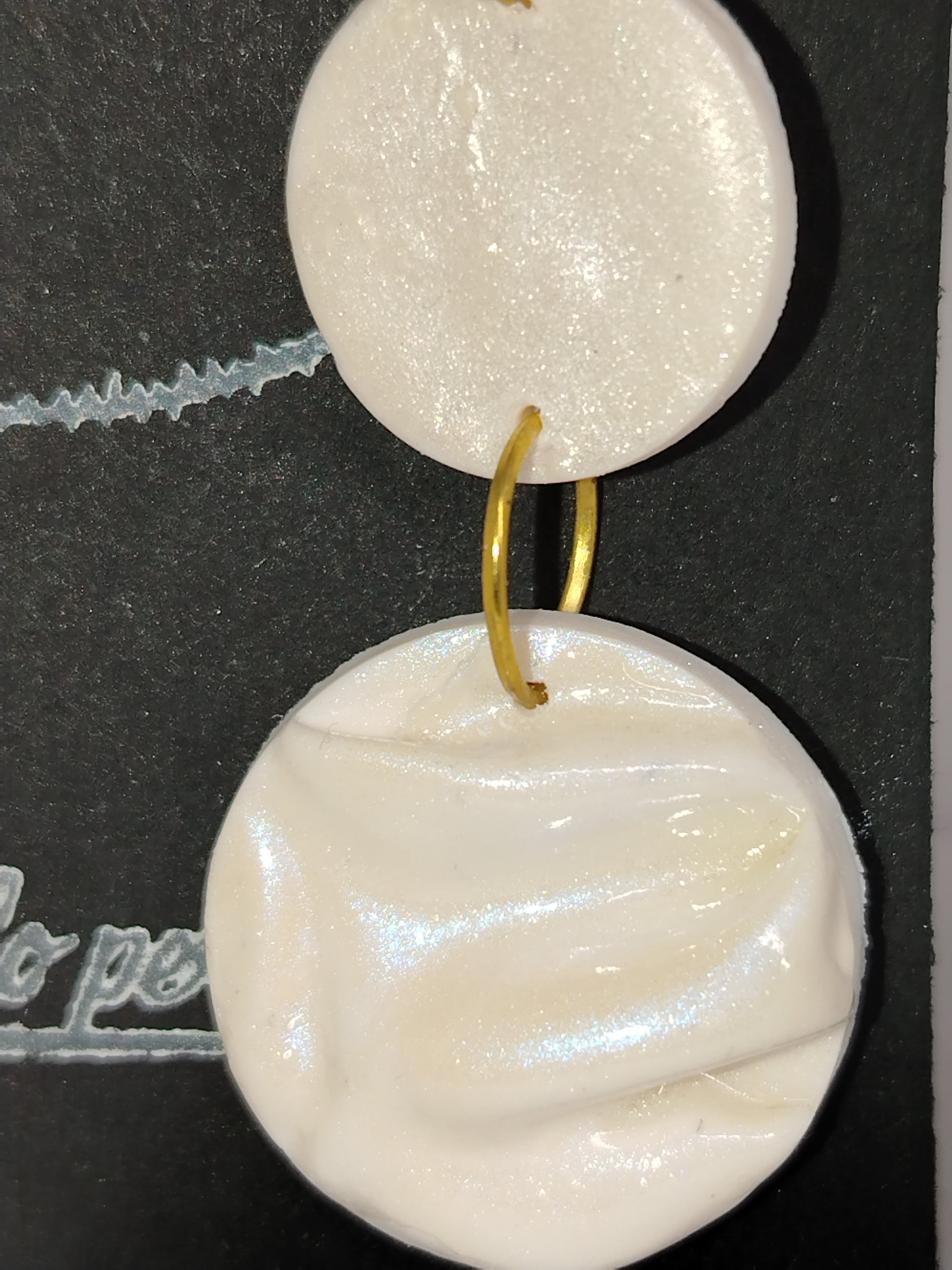 Orecchini realizzati con pasta fimo effetto Perla iridescente con texture pieghettata sul pendente Inferiore diametro pendente inferiore 2 cm e Mezzo Superiore uno e mezzo metàalleria ottone dorato lunghezza totale 5 cm