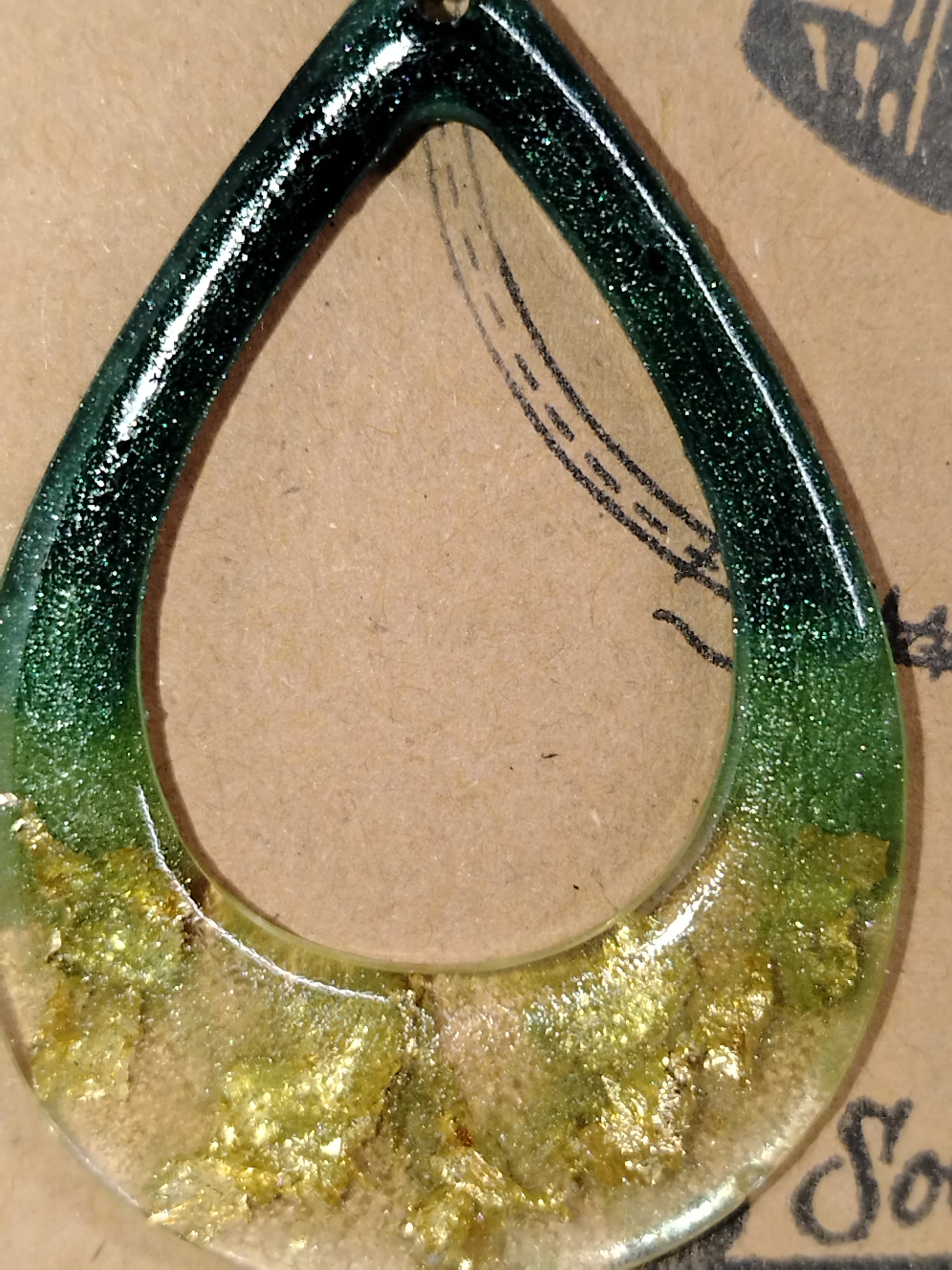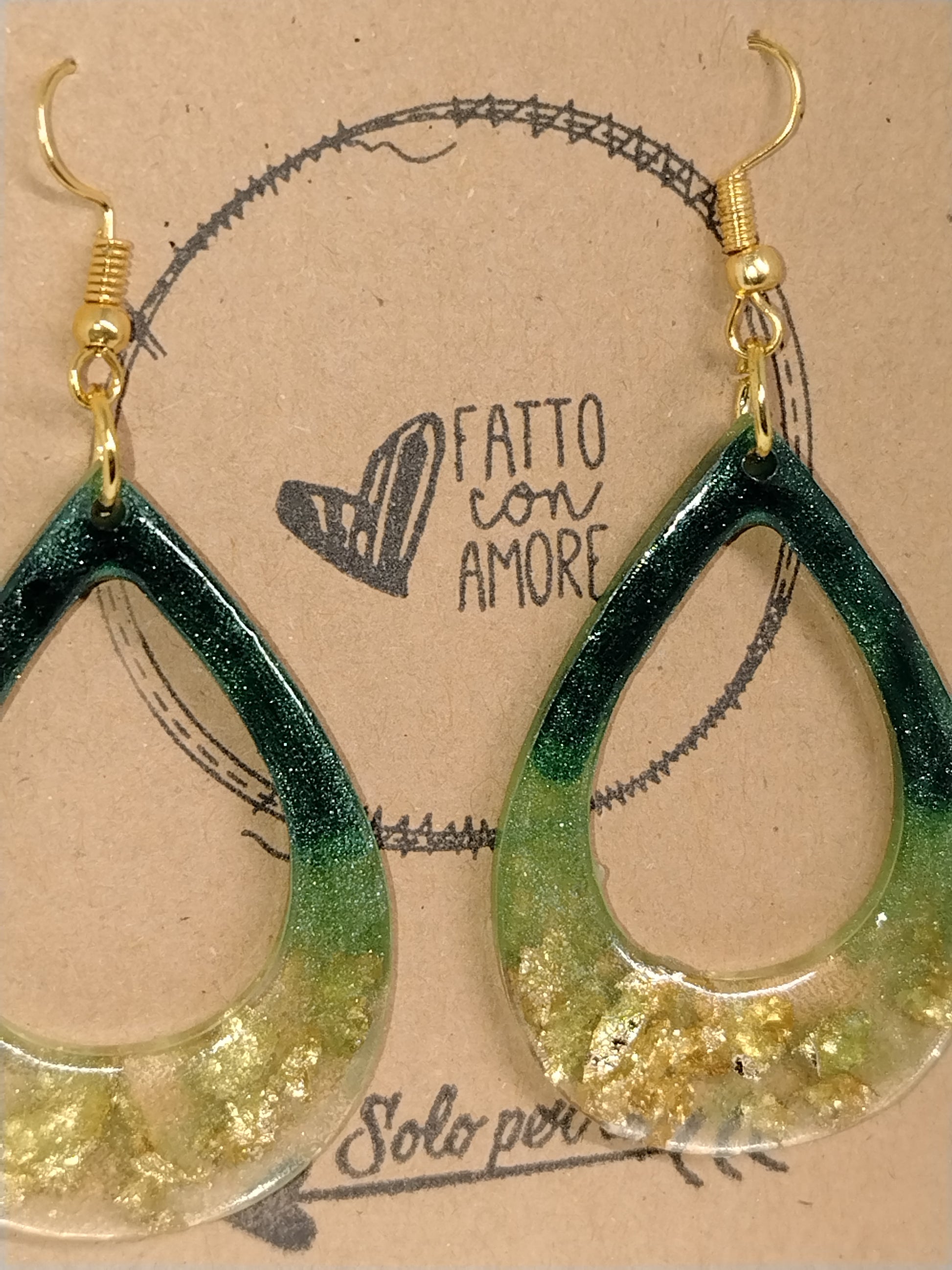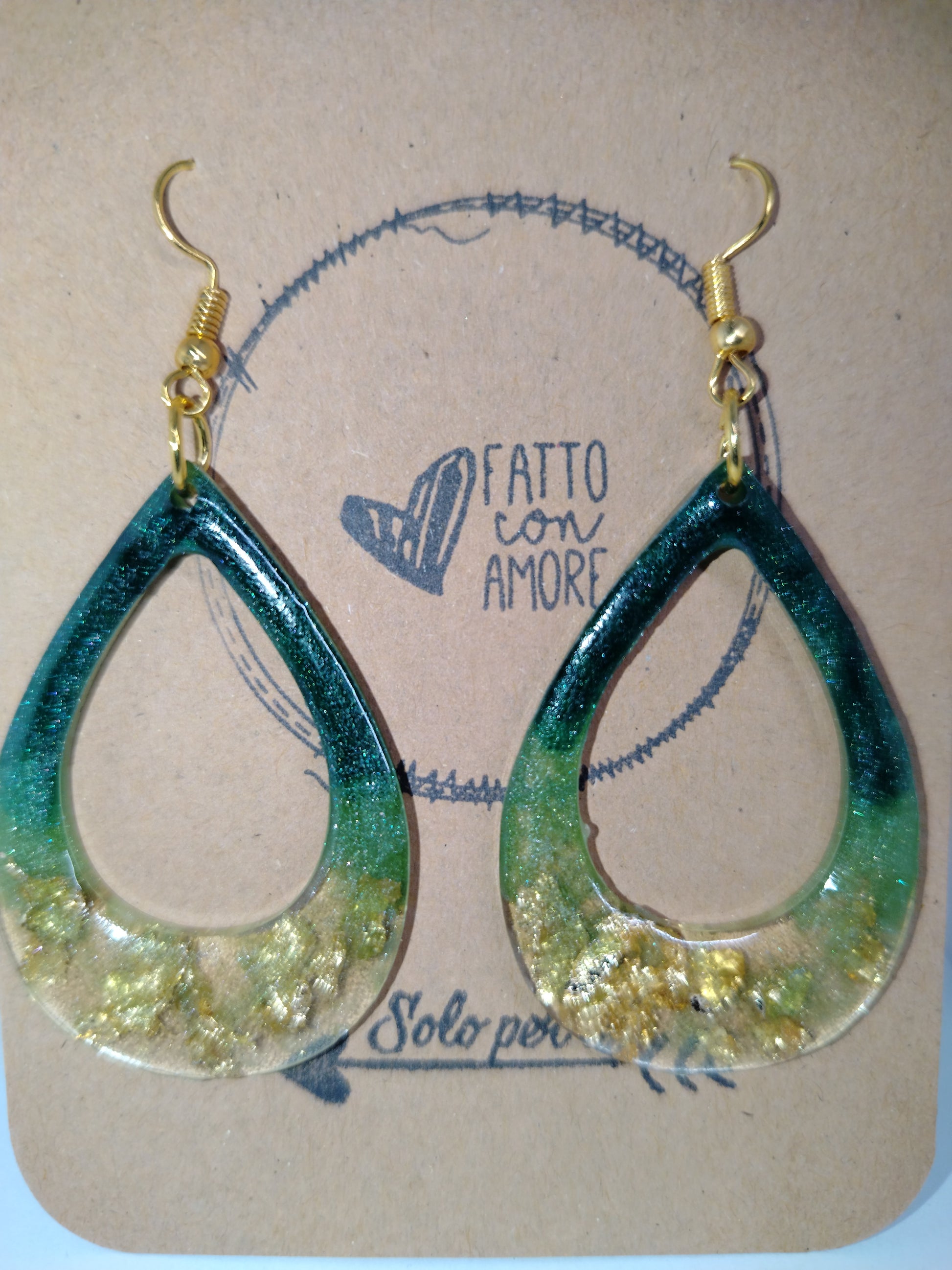 Orecchini a forma di goccia realizzati in resina Crystal con foglia oro e verde smeraldo effetto della ottone dorato lunghezza totale 4,5 cm