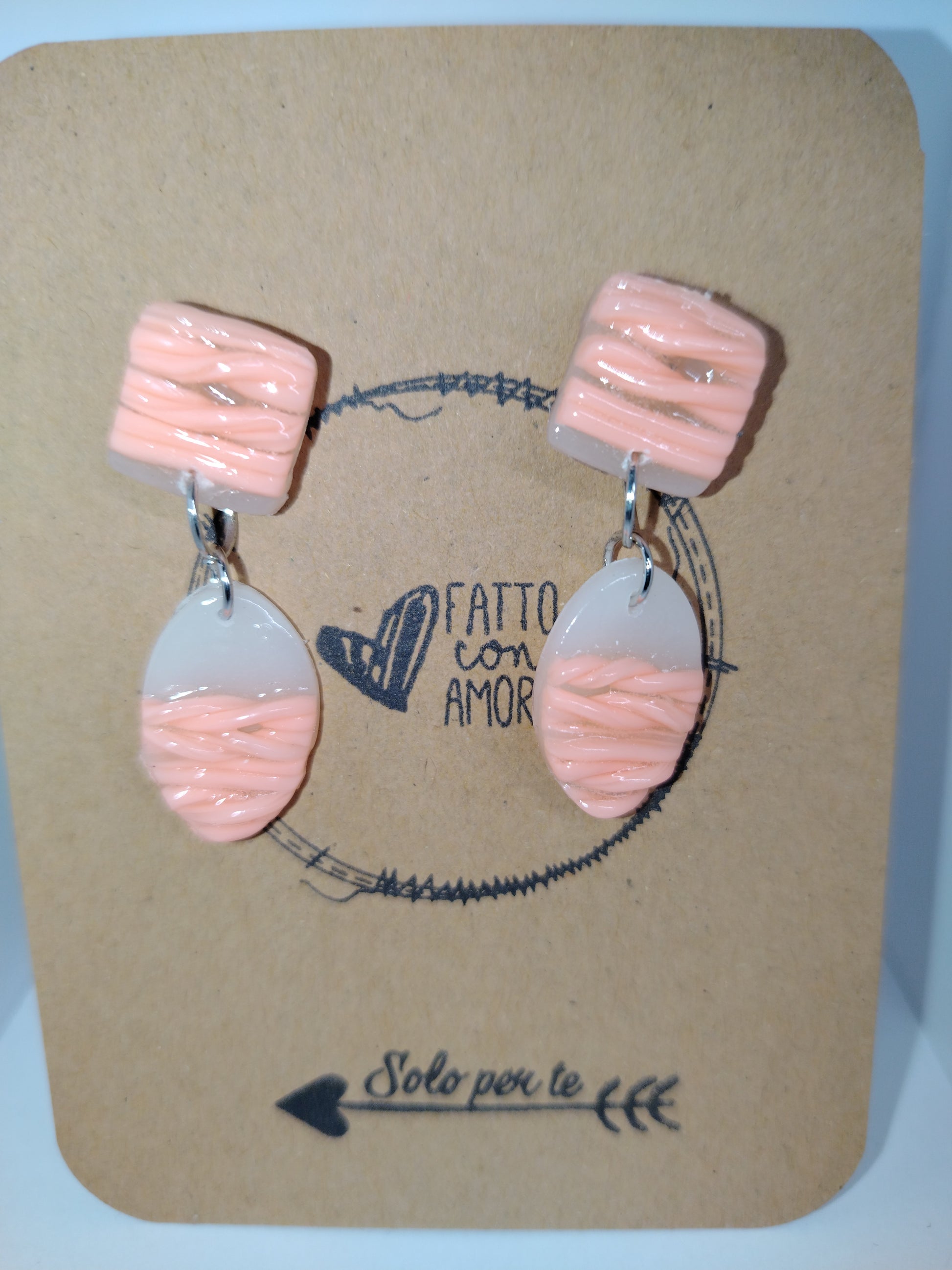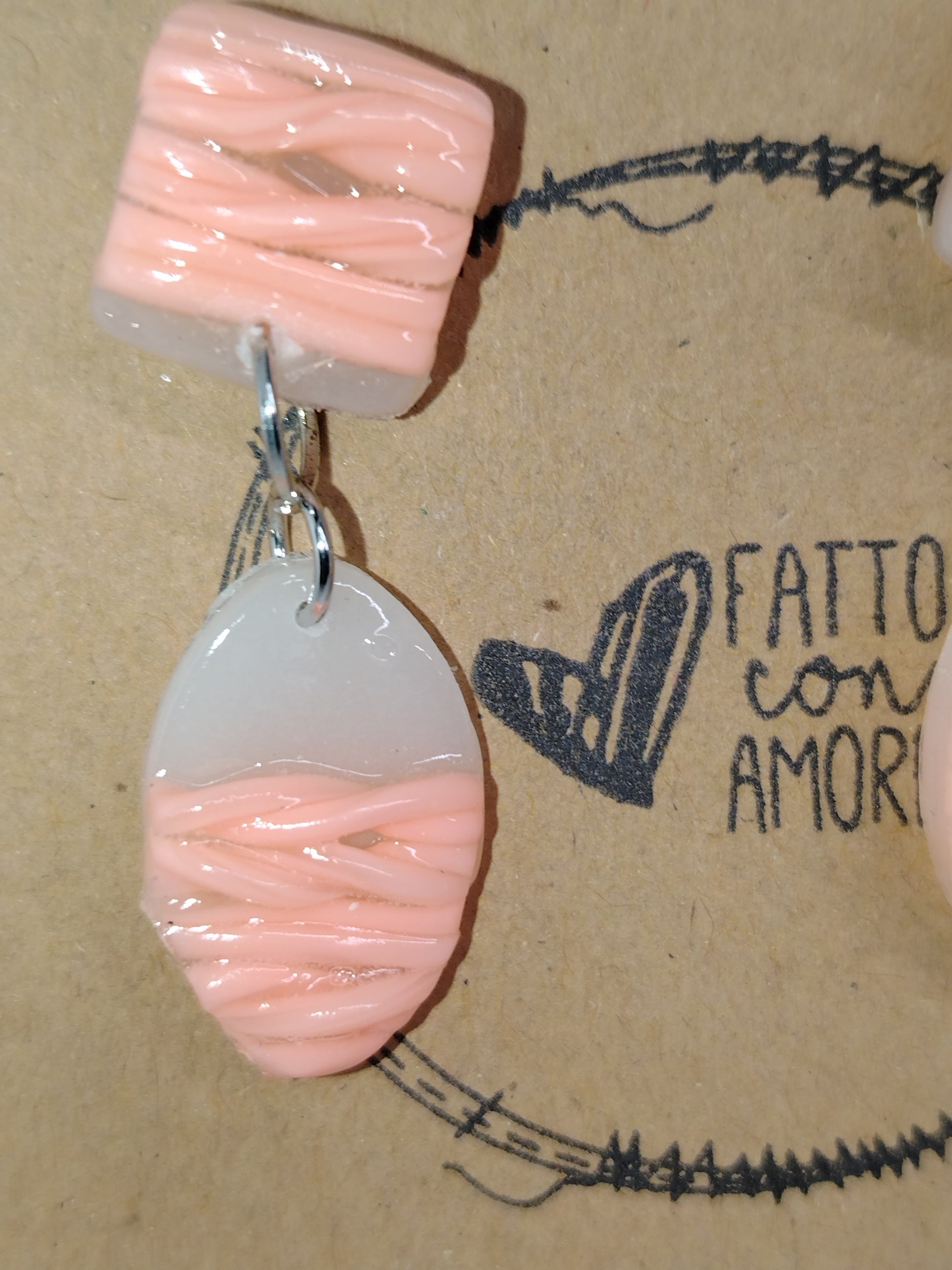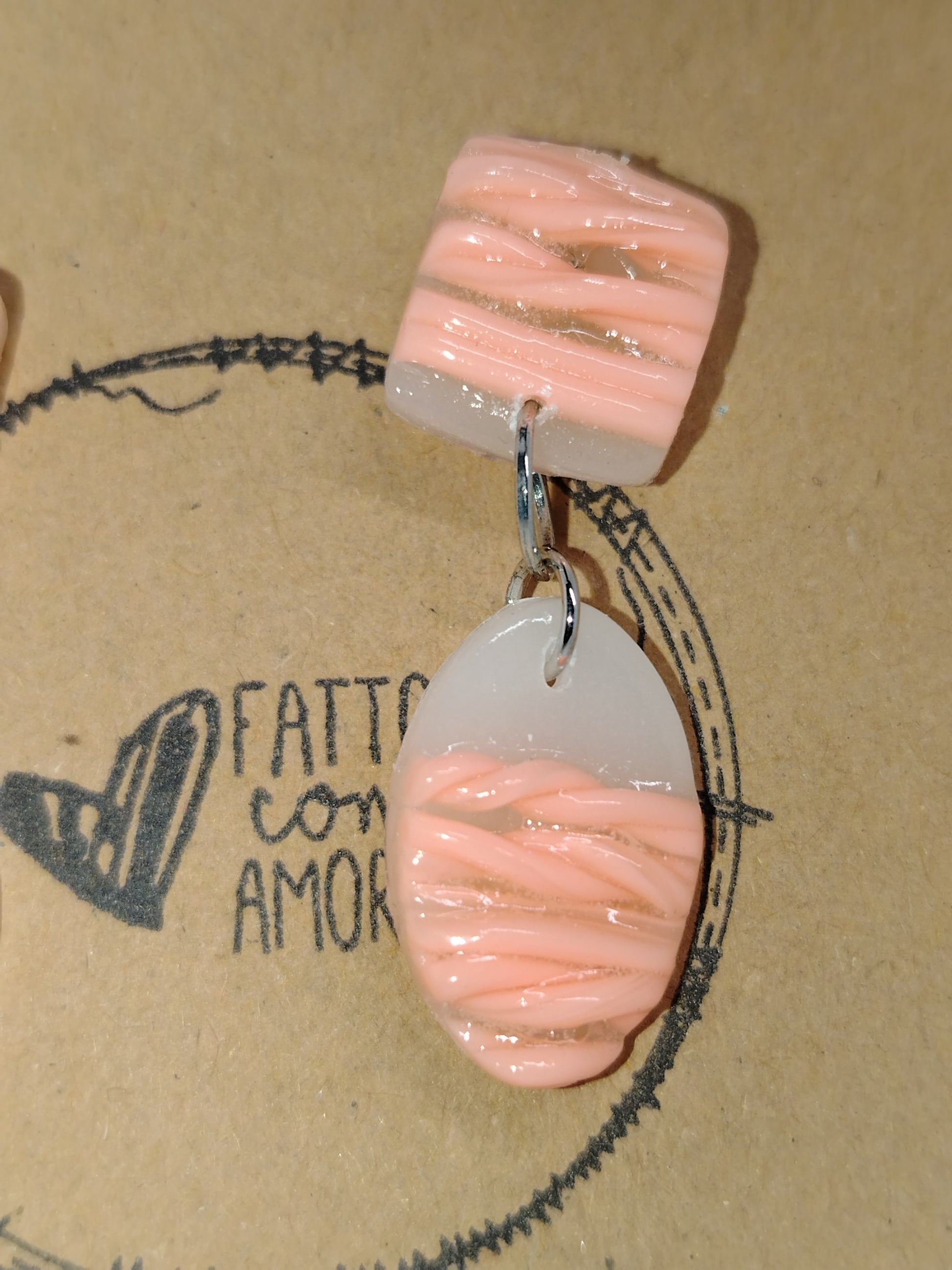 Orecchini realizzati in pasta fimo traslucida con effetto lavorazione a maglia realizzato in fimo salmone Rosa delicato misura totale 4 cm le calorie in acciaio