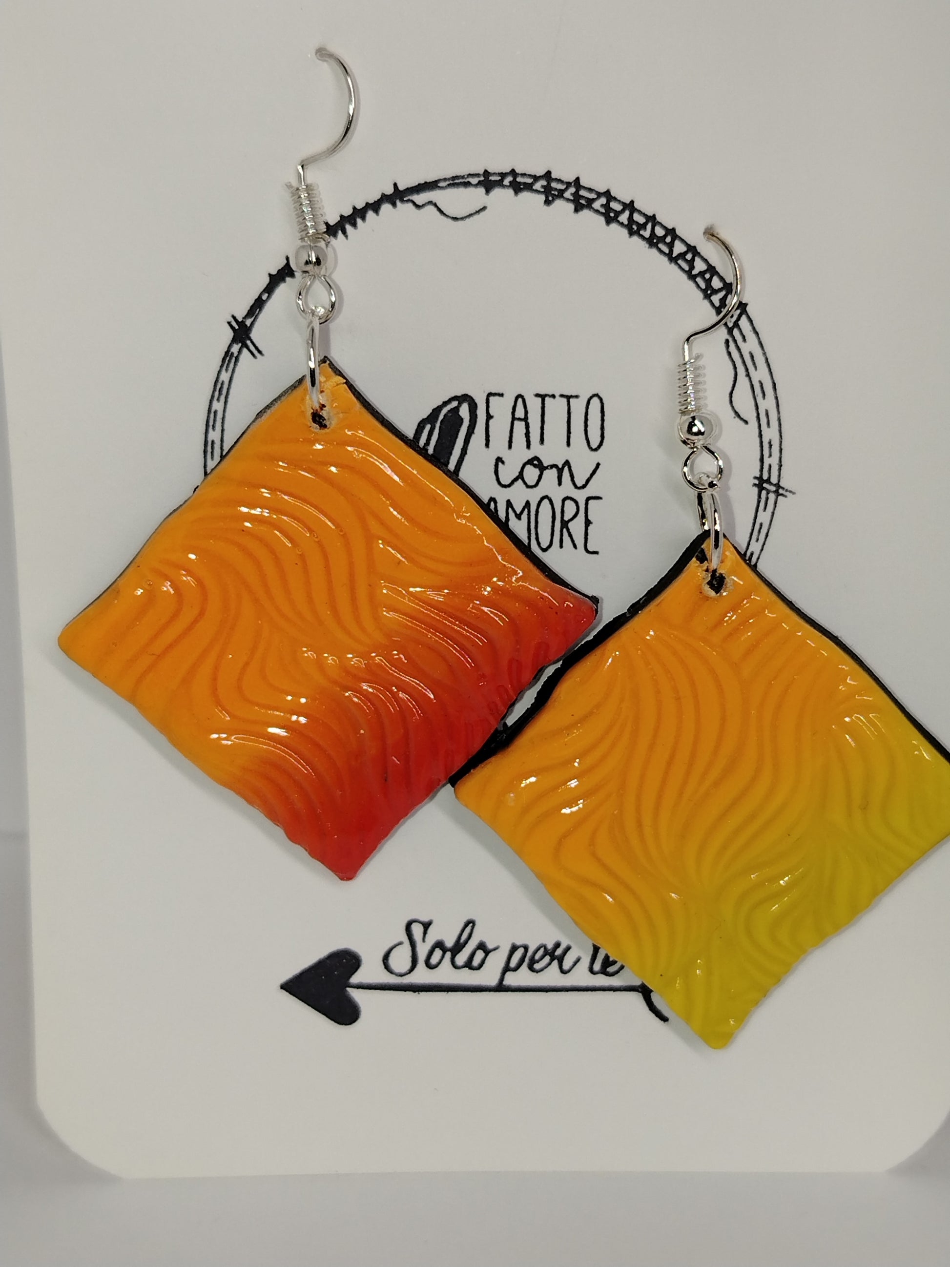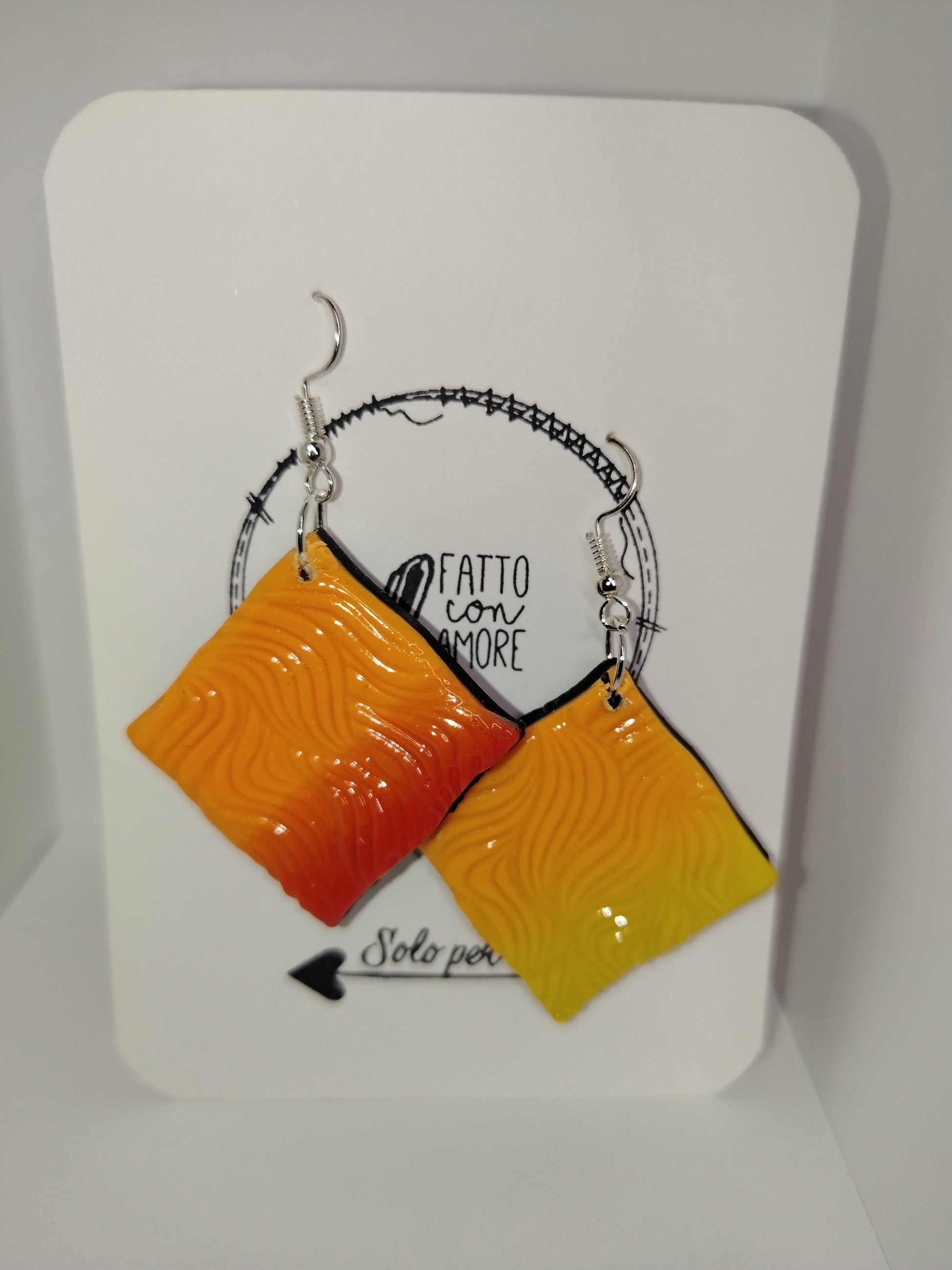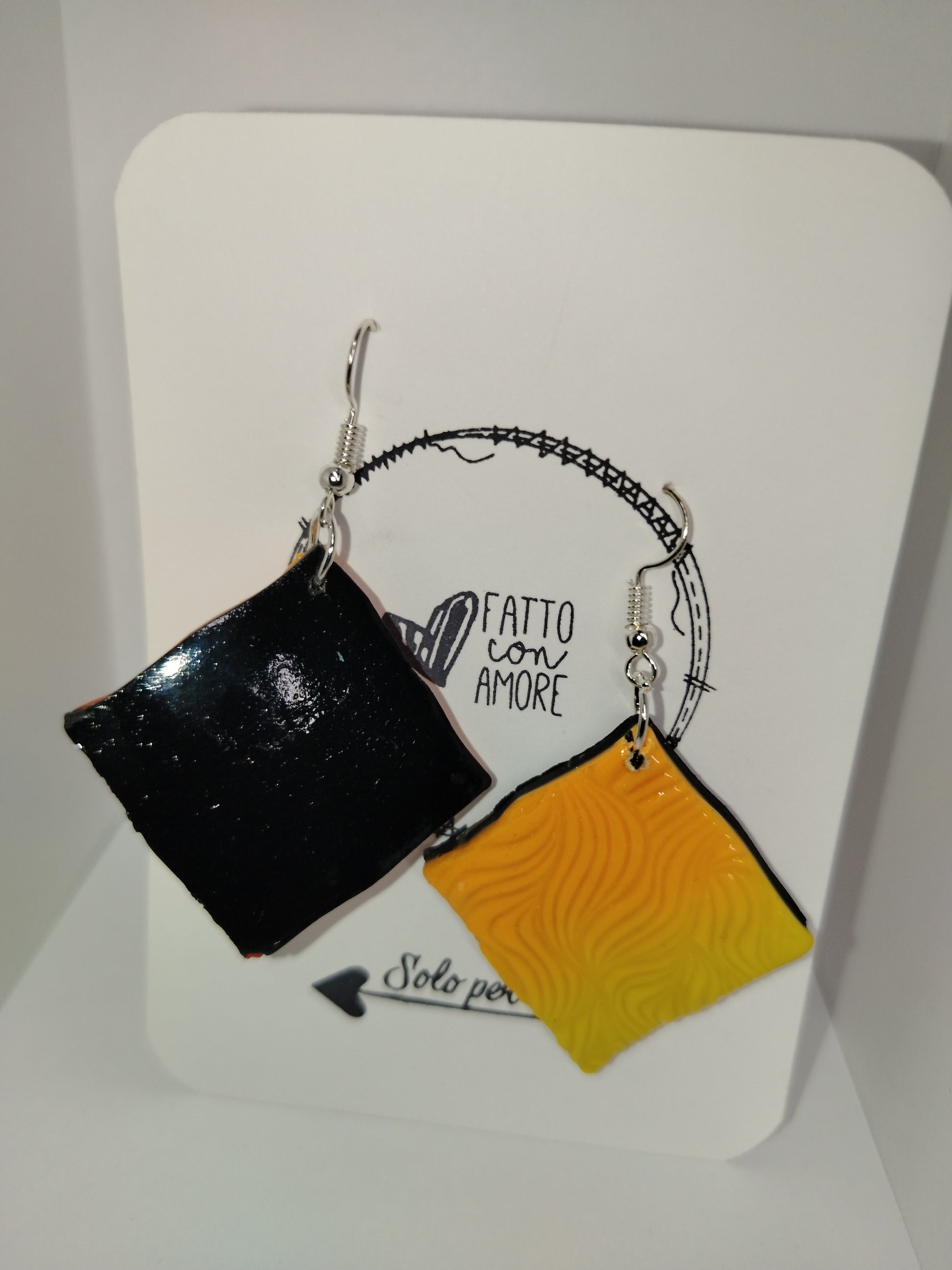 Orecchini, realizzati con pasta Cernit dalla forma quadrata con effetto degradé testurizzato retro nero. Metalleria acciaio