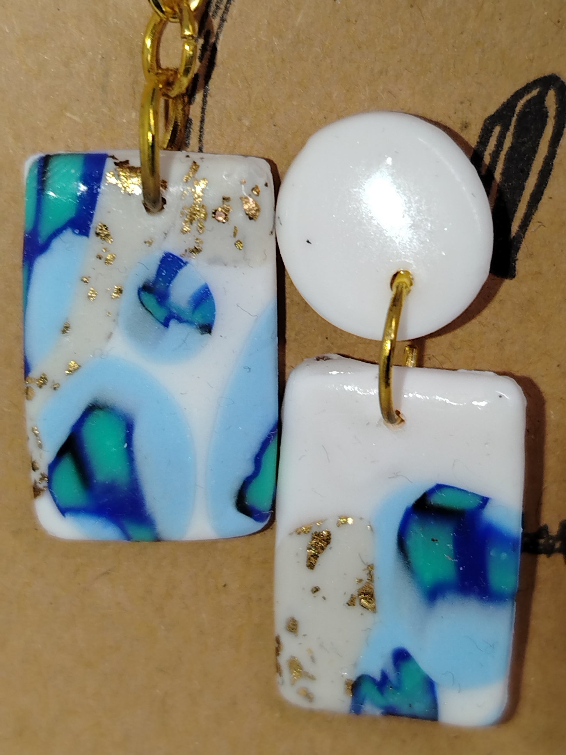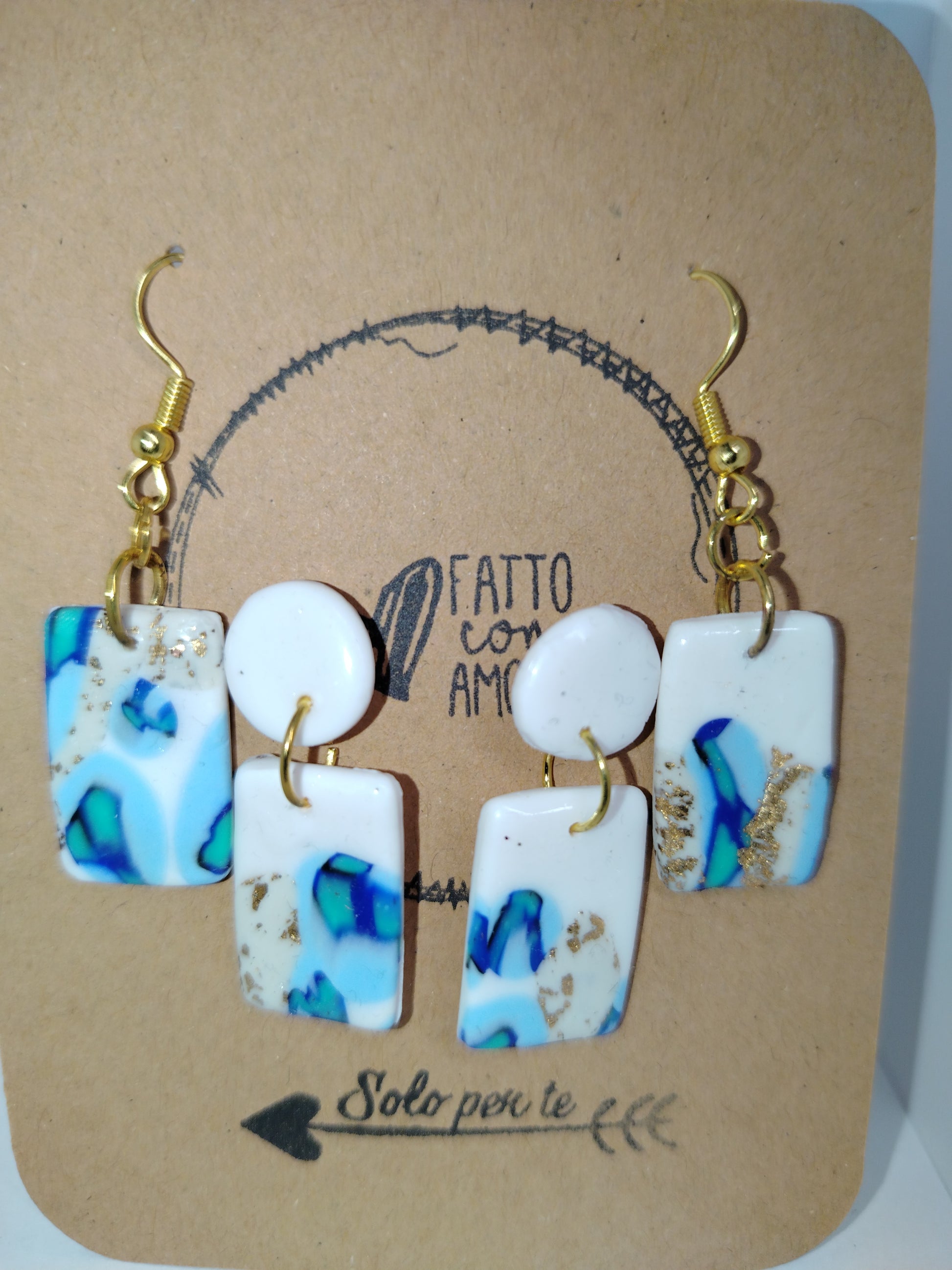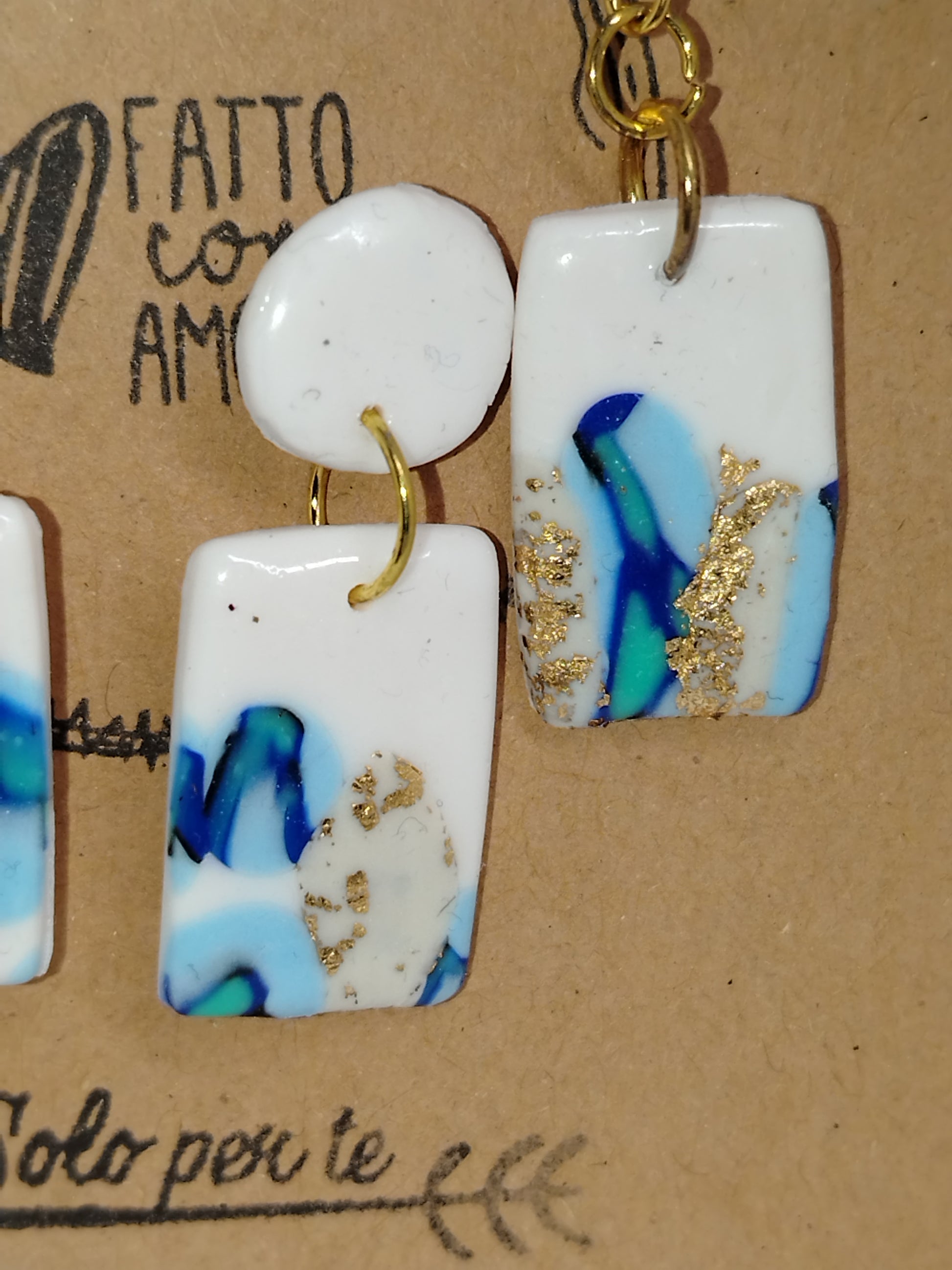 Set due paia di orecchini bianco latte foglia oro e sfumature di verde blu zaffiro metalleria ottone effetto oro