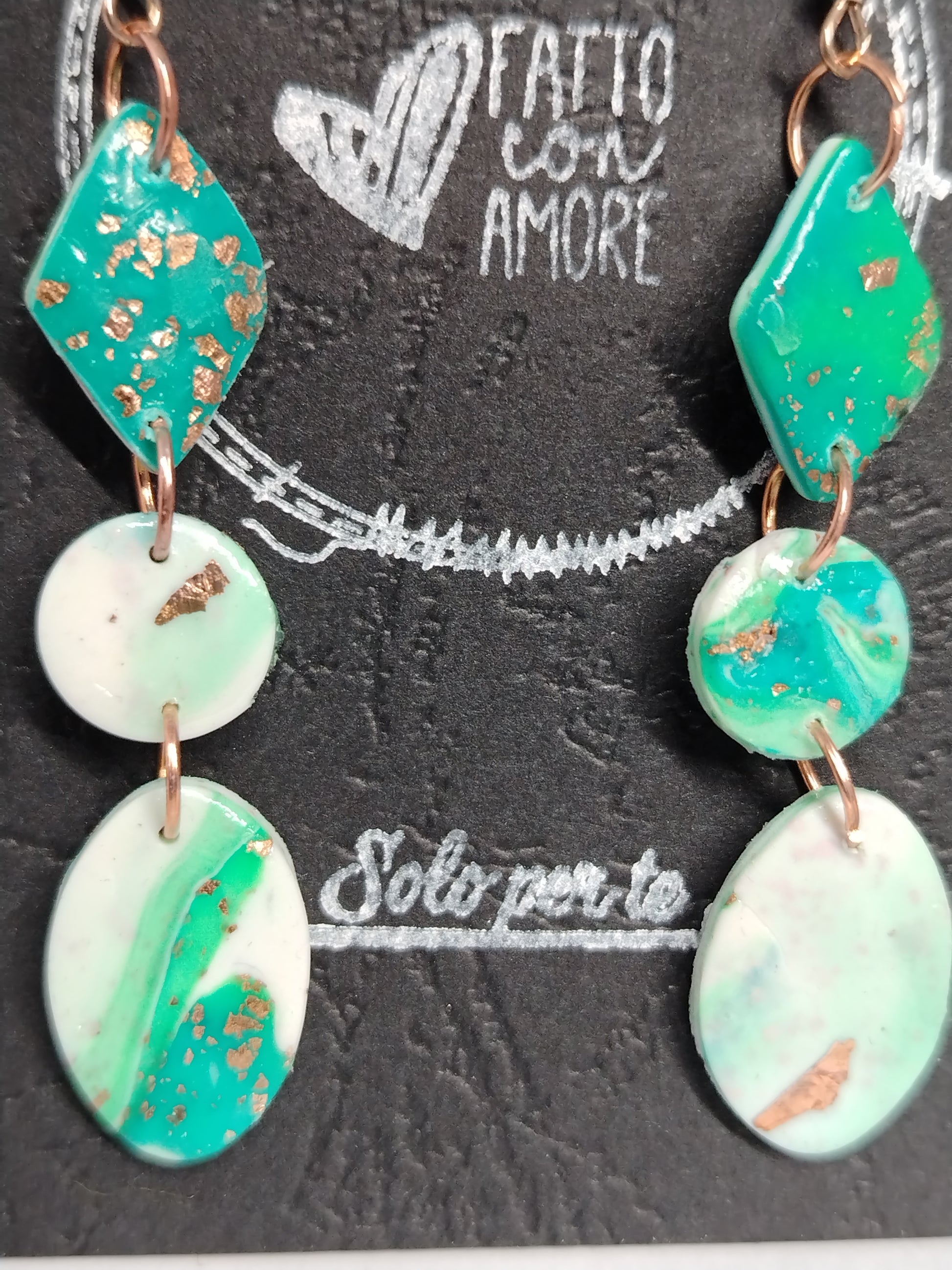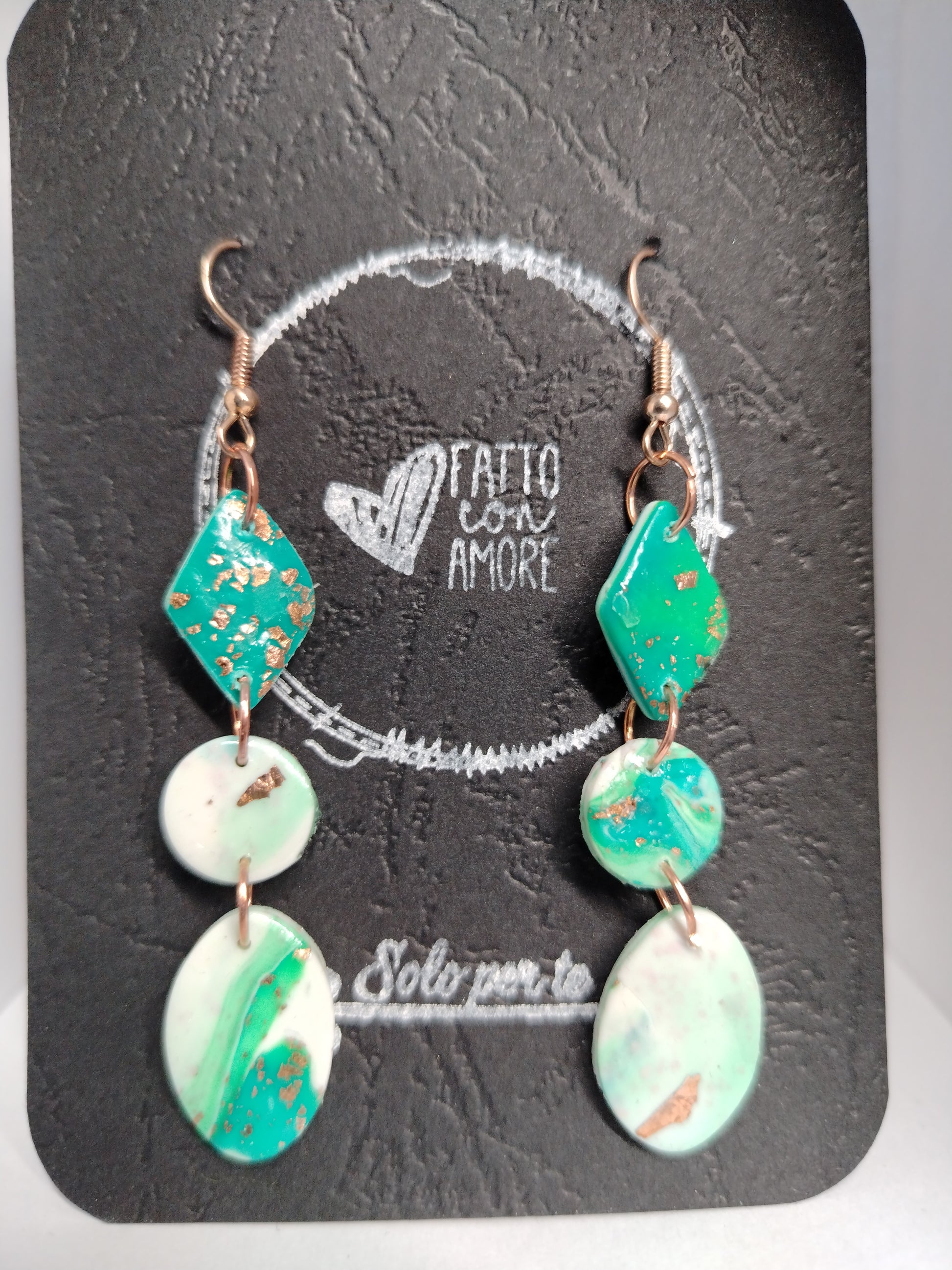 Orecchini realizzati con pasta fimo e foglia oro rose sfumature del verde smeraldo metalleria ottone Rosato